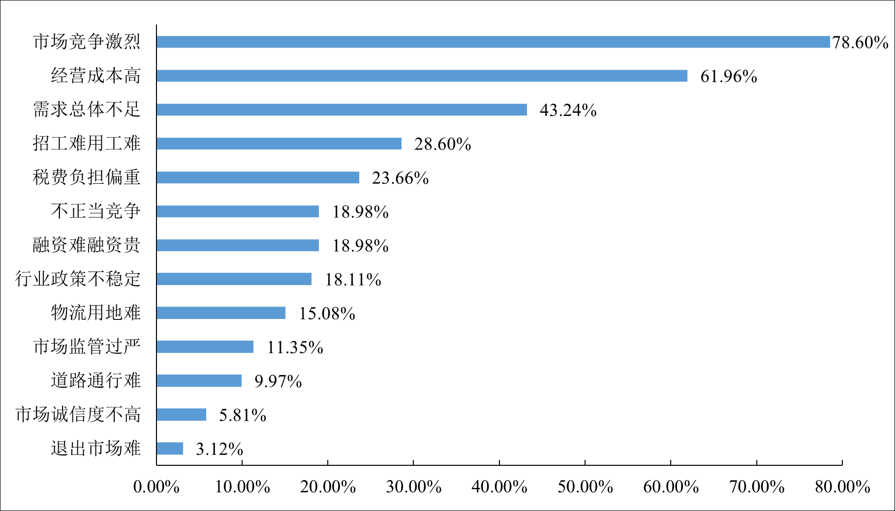 市場激烈競爭成為基本環境。調查數據顯示,對于物流企業當前面臨的主要困難,排名前三的依次是市場競爭激烈、經營成本高、市場需求總體不足,分別占78.6%、61.96%和43.24%。分業務領域看,公路貨運、水路貨運、貨運代理等領域面臨的最大困難是市場競爭激烈,而城市配送、快遞等領域主要是經營成本高。大部分領域普遍反映需求不足,成為當前制約行業發展的重要原因。
